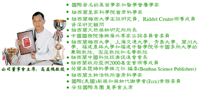 您現在的位置: 領軍人物 | 返回首頁 ![]() 高益槐教授致力於天然藥物研究,造詣精深,尤其是藥用真菌的栽培工藝、藥理活性成份研究和提取技術方面作出了傑出貢獻,並多次獲得國際榮譽。在天然藥物提取領域,高益槐教授所發明的專利技術,大大提升了天然藥物在主流醫學上的應用價值,為未來天然藥物發展,提供了全新指向。高教授的科研成果曾被《New Zealand Herald》、《星島日報》、紐西蘭國家電視臺、《人民日報》、《科技日報》、《中國政協報》、中國中央電視臺、香港《文匯報》和《大公報》等以及澳大利亞、美國、韓國、新加坡、臺灣、澳門等地的近三十家中英文新聞媒體專題報導。 高益槐教授著有《神奇的菌蕈王國》、《菇的科學》、《神農仙草-現代科學論靈芝》、《生物科技之明日之星系列》、《高益槐教授學術論文集》等十餘部著作。先後在《生命科學》(Life Science)、《藥物代謝》(Drug Metabolism Reviews)、《國際免疫學研究雜誌》(Immunological Investigations)、《國際藥用真菌雜誌》 (International Journal of Food Review)﹑《國際食物評論》(International Journal of Food Review)等國際著名學術刊物上發表論文60餘篇。 |