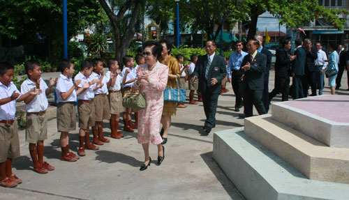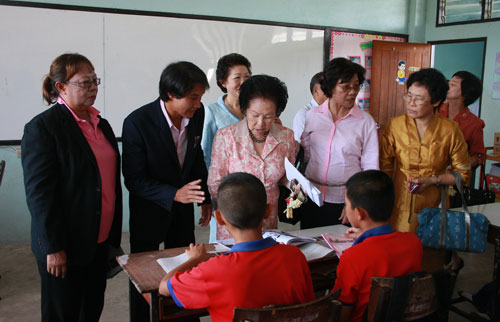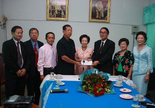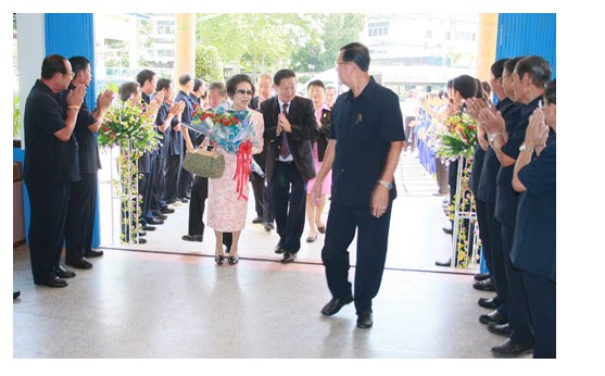 景溪景德学校蔡惠娥校长介绍说,在慈云善坛的领导下,学校逐年发展,目前学校有600个学生,中泰文老师共20多位,中文教师只有3位。下午三点抵达,该校在谢万财主席率领下计有:副主席海军少将差琳叻,老前辈谢海贤以及四十位慈云理事、学生列队欢迎。该校谢万财主席说,他本人不懂中文,但知道中文很重要,今天很荣幸得到泰国华文民校协会梁主席率团莅临本校,给予了我们莫大的鼓励。谢海贤老前辈亲向梁冰主席献花。梁主席说她本人六十多年曾来过这里,那时的景德学校是一所规模很小的学校,没想到今天踏进校门看到的是两座非常高大的校舍,理事们很团结合作,本人甚感欣慰,相信在诸位的推动之下,学校发展一定会更进一步。