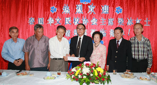 第二站思源学校,梁冰主席受到该校校董会名誉主席沈汉忠、陈宝林,名誉顾问陈镇和、许春财,主席洪壁光,副主席陈如川、林叻拉,财政黄亚蓬,校长林卿、熊娟老师和学生列队欢迎。该校主席赞颂民校协会深得泰华各界称颂,梁冰主席是热心华教发展的教育家,不辞辛劳地访问支持各华校,相信各民校的发展一定会再上新台阶。梁冰主席希望通过此次访问能给各学校的发展带来更多的发展信心与希望。该地陈成泉饼家老板陈如川先生热心华教事业,为当地华校的发展倾心努力,梁冰主席谓其堪为榜样。