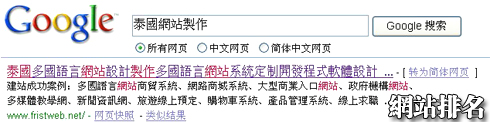登錄www.google.com 輸入“泰國網站製作”或者“泰國網站設計” fristweb均排名第一。
